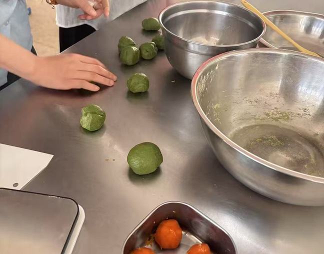 活动当天,社团的成员们早早地来到活动场地,精心布置现场,并准备了充足的制作材料,其中包括糯米粉、澄面、麦青汁、金丝肉松、开水等制作青团的时候他们分组合作,有的负责将开水倒入准备好的糯米粉中;有的负责用手将面揉好;有的负责将面分成一个个小块的,大家默契配合;其他的人可以将准备好的馅料包入擀好的面皮中。整个过程中,大家分工明确,配合默契,忙得不亦乐乎。