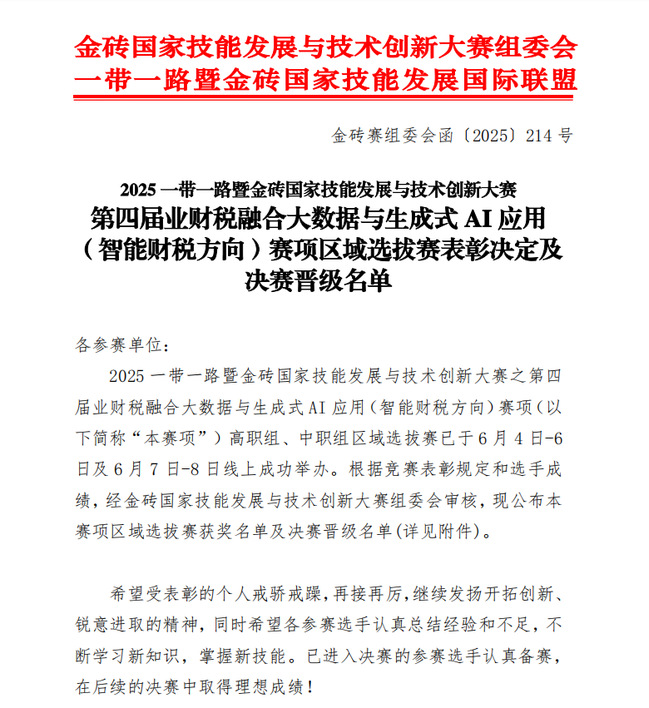 近日,2025一带一路暨金砖大赛之第四届财税融合大数据与生成式AI应用(智能财税方向)赛项区域选拔赛圆满落幕。管理工程系学子在比赛中表现优异,两支队伍脱颖而出,共斩获二等奖1项、三等奖1项,展现了扎实的专业技能和卓越的团队协作能力。