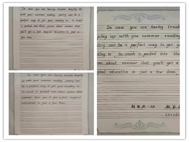 此次比赛要求在规定的时间(40分钟)内正确、规范地书写现场提供的英语段落。同学们以极大的热情和认真的态度参与了这次活动,他们认真书写,充分展示自我,字母书写标准,字迹流畅端正,卷面整洁漂亮,令人赏心悦目。