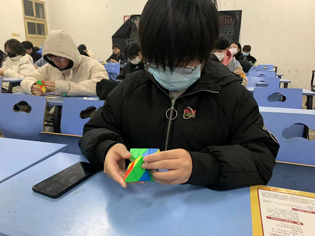 为丰富学生校园生活,展现课后服务益智类成果,应用数学社团特开展本次活动。12月4日下午“金字塔魔方速度竞赛”在天井湖校区图文楼502教室开展。本次活动要求社员们在规定时间内把金字塔魔方拼完整,并根据用时长短选出获奖名单。
