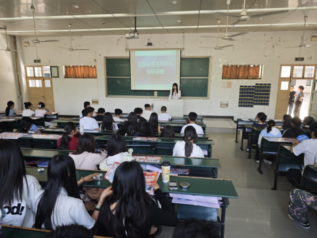 讲座中,徐老师结合多年教学经验,从专升本政策解读、考试科目分析、复习方法指导、时间规划建议等方面进行了系统讲解。她详细介绍了近年来安徽省专升本考试的报考流程、招生政策变化及热门专业趋势,帮助学生明确目标院校和专业选择。针对考试科目,徐老师重点讲解了英语、数学、语文等基础科目的备考技巧,强调夯实基础、强化训练的重要性,并分享了时间规划方法、真题演练策略及应试心理调适技巧。