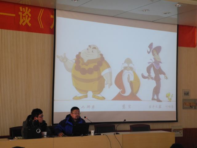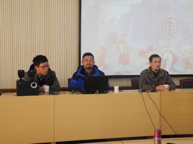 2012年12月12日中午,教学楼301教室座无虚席,气氛热烈。安徽中卡通公司的朱导和顾主任,应学院邀请,前来为动漫专业的同学进行一场有关动画制作的专业讲座。朱导是中卡通公司制作的中期导演,在动作表演、人物造型方面有着深厚的造诣。此次前来,以《九华小和尚》的制作过程来和同学们分享动画制作过程中的多个环节,以及如何提高自身专业能力。