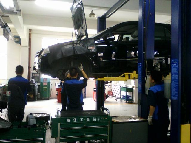 图1:学院、华胜公司领导与beat365学生员工进行座谈 图2:院领导与beat365学生员工在车间进行交谈 图3:beat365学生员工正在对汽车进行维修保养