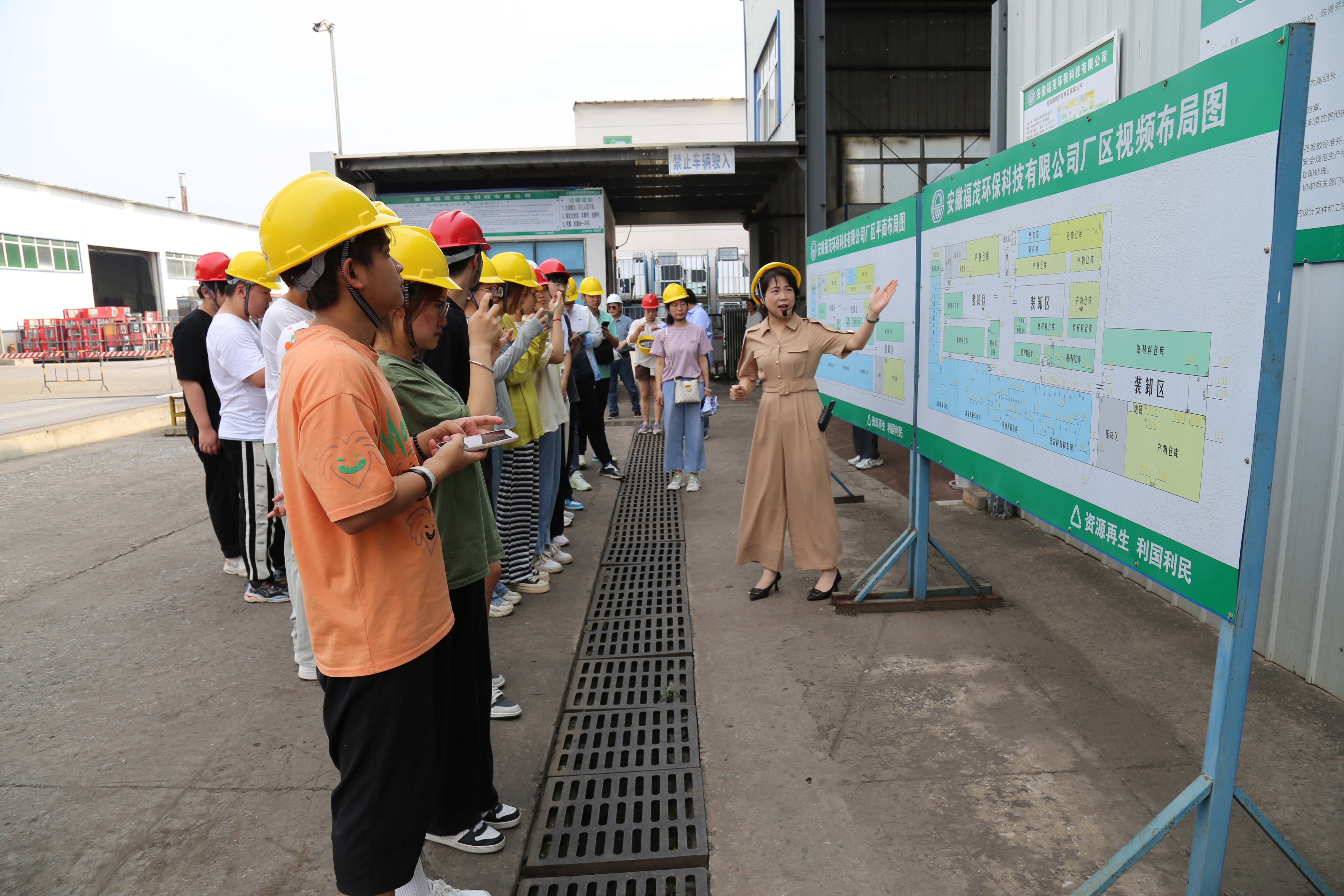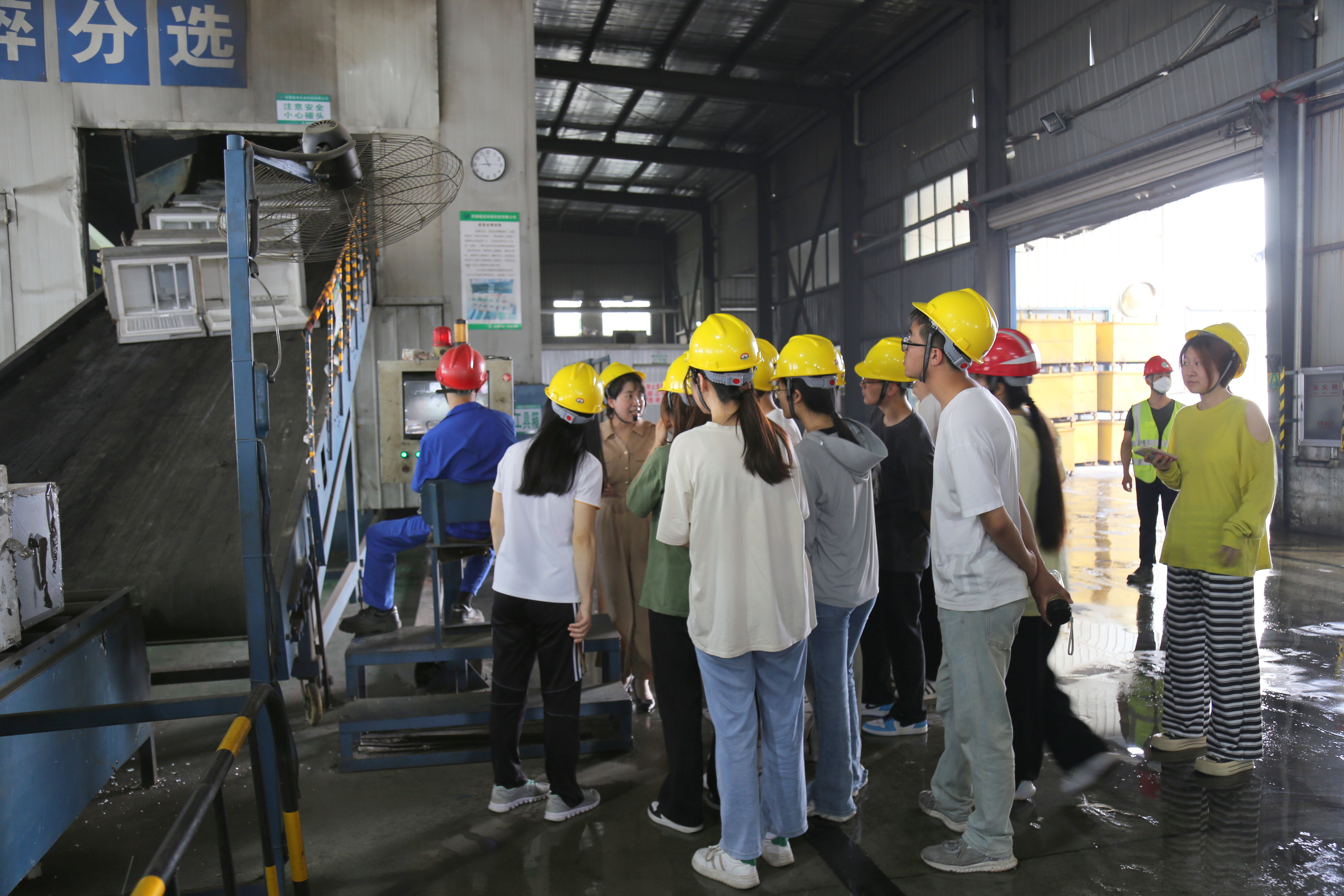 进入生产操作区之前,企业为师生们发放安全帽,并手把手指导大家如何正确佩戴。随后,在李总的带领下,师生们先后参观了原料储存库、废旧洗衣机拆解线、废旧电视机拆解线、废旧冰箱拆解线以及废旧空调拆解线。