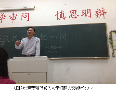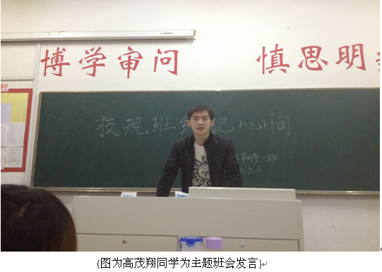 为了维护学院正常的教学和生活秩序,创造优良的学习、生活环境,建设优良的学风、校风,促进同学们的健康成长,使同学们能够更好的了解校规,遵守校纪校规,在2014年5月6日晚13机修一班在教室206召开“校规班纪记心间”主题班会。