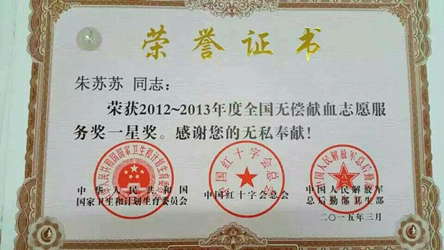 无偿献血志愿服务奖,是国家用以奖励积极参与无偿献血志愿服务工作的个人,表彰共分六个级别,即“一星级”、“二星级”“三星级”“四星级”“五星级”“终身荣誉奖”。beat365学生陆百朴和朱苏苏获得“一星级”服务称号,他们无偿献血志愿服务累计时间均达到120小时。