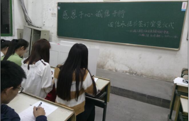 2017年4月20日晚七点,我系在教学楼508教室开展“感恩于心诚信于行”诚信承诺书签订、宣誓仪式,本次活动主要面向15和16级贷款学生及享受各类奖助学金的经济困难学生。本次活动主要包括两方面的内容:诚信承诺书签订以及宣誓仪式。活动由我系学生会实践部部长主持,开场首先向大家阐述做一个诚信大学生的重要性,紧接着一同带领大家认真宣读承诺书上内容并且签字,最后全场同学一同起立用一颗诚挚无比的心去念出那句句铮铮誓言。这次活动的目的:培养学生诚信待人,以诚信与别人交流,关心他人,对他人富有责任心,严格要求自己,在学校做一个守纪的学生,将诚信融入日常生活中的每一件小事,真正做到诚实守信。