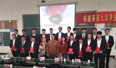大会第一项,学生会全体起立奏唱团歌。随后,系党总支方书记上台致辞,指出学生会成员之间要相互团结,各部门之间协同工作;由系团总支书记丁老师宣读第九届学生会成员名单并宣布机械工程系第九届学生会成立。三位老师对第九届学生会主席及各部门部长颁发聘书并合影留恋。