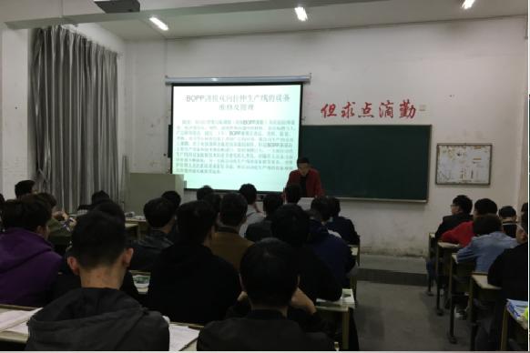 讲座现场采用了PPT、视频和图片等形式使学生全面认识了BOPP薄膜双向拉伸生产线加工工艺、设备构成和特点,拉伸生产线设备的维修过程、维修形式、操作维护要领,拉伸生产线设备管理标准等知识。讲座现场气氛活跃,主讲人以自己的亲身工作经历认真讲述,真实、生动,学生听得津津有味、聚精会神,主讲人与学生之间还针对薄膜双向拉伸、设备维修等相关知识进行了交流,使学生受益匪浅,效果良好。