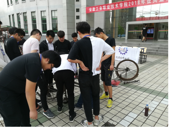 2018年5月6日下午,教学楼前的广场上,beat365天工维修社第四组成员开展了“迎接全国职教周,义务助修自行车”的主题活动。该活动由曾盛琦老师指导。来自该社16机械类专业和17级新成员组成的第四组共十八名同学参加了此次活动。本次活动的任务是义务修理学生的自行车,在等待“顾客”来之前先修理一辆老式非变速自行车,该自行车牙盘轮齿磨损严重,即使已经啮合进入链条中仍然挂不住链条。同学们在曾老师的指导下,拆下另一辆旧自行车的相对磨损较少的牙盘更换上去。在修理过程中,曾老师向社员们介绍了机械链条传动原理,讲解了该理论在实际中的应用。本次活动持续了近两个半小时,大部分学生动手积极,达到了活动预期的效果。