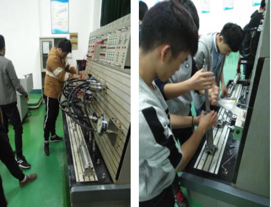 在近二个月的周末中,吴老师利用液压与气动实验室进行培训,运用并强化液压与气动的相关知识,同时锻炼了学生对液气压元件、基本回路的实际操作能力以及液气压原理的运用,提高学生实践动手能力,培养学生的创新意识和创新能力。在培训中还结合信息化教学APP对培训班进行过程性评价。
