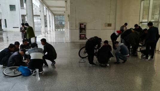 018年11月17日下午,立冬后的第一场小雨使人感觉气温有明显的下降。但在教学楼门厅里,天工维修社的自行车拆装活动却如期进行。本次活动由该社的第一、二组的29名成员参加。该活动由指导教师曾老师指导,主要是为了让18届新社员对机械知识有个直观的了解,为将来的理论学习做个基础。该活动除了众多机械系新生参加,还吸引了电气系和管理系的多名同学。社长为了让来外系的同学也能参与,特地把活动改成了院级活动。现场活动分成了机电系同学组和管理系同学组进行对比拆装,拆装内容各为一辆非变速自行车,了解自行车的各种零部件的结构和作用,不懂之处由老师指导。最后由指导老师骑行验收,令人意外的是,管理系同学居然本次活动中无论是拆装速度还是质量居然都稍快和稍好于机电系同学。该持续了近两个小时,大部分学生动手积极,收到了活动应有的效果。