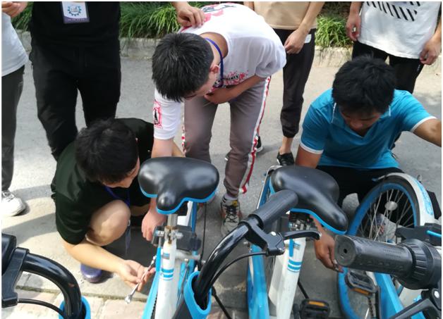 本次活动的任务是与沈总和修车员一起巡检万达广场一周的共享单车。巡检从下午3点钟开始,主要工作包括补齐单车上缺失的零件、调整链条的松紧度、擦除盛物篮内的小广告和规整散乱的单车。沈经理介绍说,我市共有4家共享单车公司在营业,哈罗单车占据了约40%的市场份额,虽然总体我市市民素质较好,但还是有少数人的不文明的行为,如用盛物篮里坐超重了的小孩,使得部分盛物篮发生变形;还有在篮子底部贴小广告严重影响了底部的太阳能电池的使用,不得不喷专用去除剂和用刮刀来铲除它。修车员也向我社的同学介绍了链条合适的松紧度的调节方法,介绍了该单车与日常单车结构的不同之处,介绍了每辆单车识别码的唯一性等等,使我社同学们初步了解了该行业的大概情况。本次巡检活动持续了一个半小时,让我社同学们知道了方便的骑行背后有很多默默无闻的修车工们付出的辛劳和汗水。在巡检中,同学们兴致都比较高,动手积极,达到了活动应有的效果。