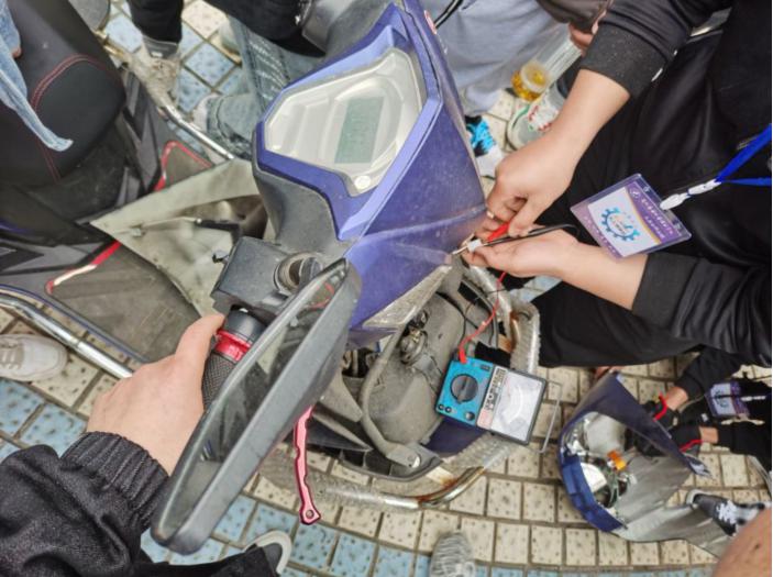 2021年4月2日下午,立夏后的周末气温使人感觉稍有闷热。但在我校行政楼后面的一块空场地上,天工维修社的电动车预维修活动却如期进行。本次活动的主题是“熟悉电动车,准备服务公众”, 目的是为了让20届新社员对电气、机械知识有个直观的了解,为将来的服务公众和理论学习做个基础。本次活动由该社的正副社长带领20名来自西湖校区的20届新成员开展。指导教师曾老师一开始提供了大致的指导和实操电动摩托车,预维修目的是解决前大灯不亮的问题。这次活动都是机械系各专业包括机制,机修,数控,模具的新生参加。社长为了让所有的同学将来都能有机会参与,特地把活动人数控制在第一组的20名。现场两位社长具有一定的以前拆装自行车的经验,在发挥机械专业知识外,还使用了他们在电工实训课上制作的电表,指导大家顺利地拆解了电动车的前面板,测量并找到了脱焊了的电线接点。最后由指导老师骑行验收,结果令人满意。本次预维修活动持续了近两个小时,作为第一次拆装和查找电动车电路断点速度都是令人满意的,收到了活动应有的效果。