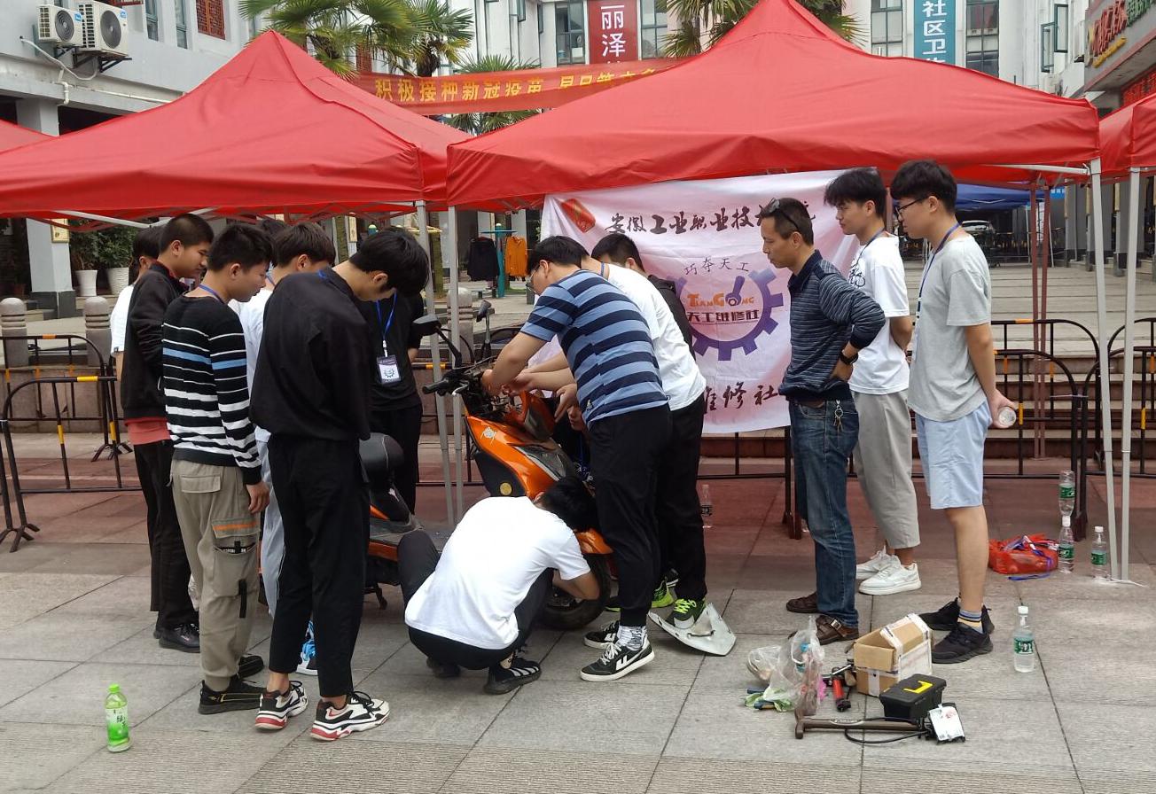 为贯彻落实2021年全国职业教育大会精神,弘扬劳动光荣、技能宝贵、创造伟大的时代风尚,宣传展示安工学院技能创造美好生活、职业教育的改革发展成果,进一步营造全社会关心支持职业教育的良好氛Χ,响应beat365职业教育活动周,天工维修社于5月22日上午9点至11点在映湖山庄社区大门口举办了一次免费为民众保养电动车的服务。