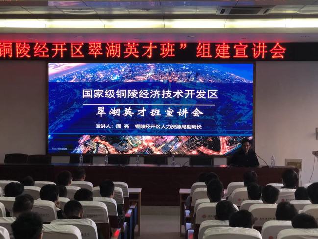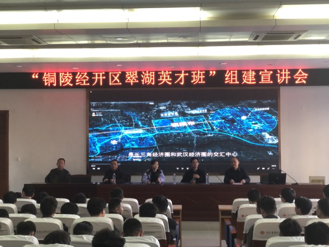 为贯彻落实《国家职业教育改革实施方案》等文件精神,系统深化职业教育人才培养模式和方式,推动职教与就业有效衔接,11月15日,在阶梯201报告厅召开“铜陵经开区翠湖英才班” 宣讲会。机电学院院长陈静,铜陵市经开区人力资源局副局长周亮,教务处、招就处等部门负责人及100多名学生代表参加了大会。