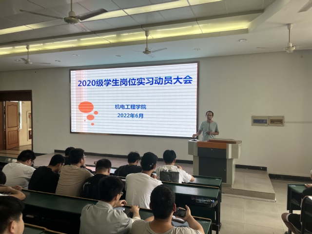 为贯彻落实学院教学任务和就业工作精神,加强学生对岗位实习的认识和了解,6月8日机电学院在阶梯101教室召开了2022年机械类专业岗位实习动员大会,机电学院分管教学和学生工作负责人及2020级机电设备技术、机械制造及自动化、模具设计与制造、数控技术、汽车检测与维修技术5个专业的171名学生参加了本次动员大会。