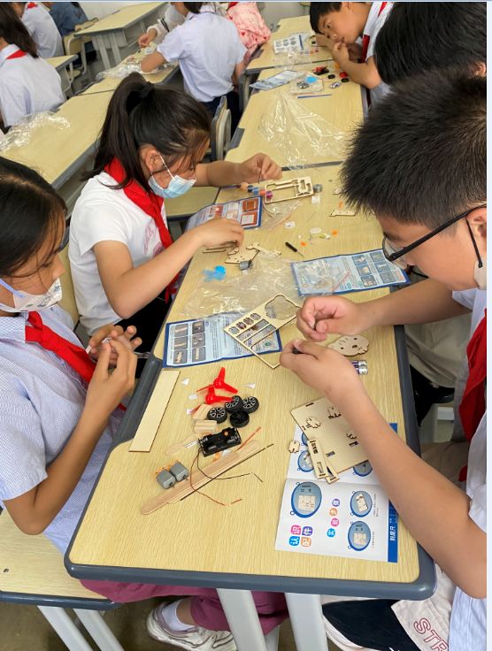 理论知识讲解完后,给各位同学发放了科学实验套件,同学们根据图纸将一块块零件拼装成了手摇发电机、电风扇、双螺旋桨飞机等模型。