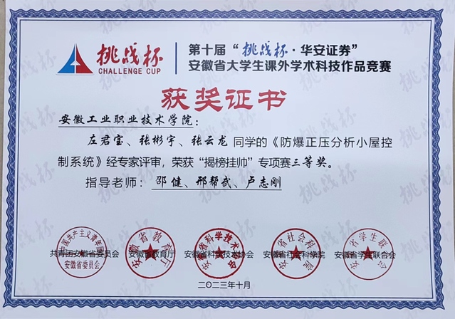 决赛中,经作品展示、线上答辩和专家评审等多个环节的激烈角逐,左君宝等同学的作品《防爆正压分析小屋控制系统》在邵健、邢邦武、卢志刚老师指导下,荣获省赛三等奖。