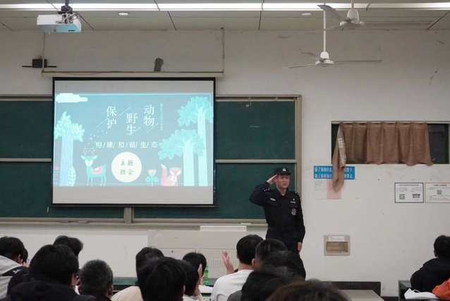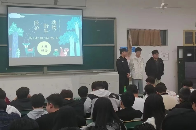 为了表扬陈尚和段君瑞同学对大自然和生命的热爱,同时带动更多的学生爱护野生动物,5月6日,铜陵市特警支队四大队大队长张吾俊同志一行三人走进校园,对两位同学表示感谢并进行野生动物救护科普宣传,在阶梯103教室,特警同志和22机电1、2班的同学们一起开了一场生动的“保护野生动物,构建和谐生态”主题班会,提升了同学们保护鸟类的意识,呼吁同学们要向陈尚和段君瑞两位同学学习,关注自然生态保护,自觉加入到野生动物保护的行列,携手共建人与野生动物和谐的美好家园。