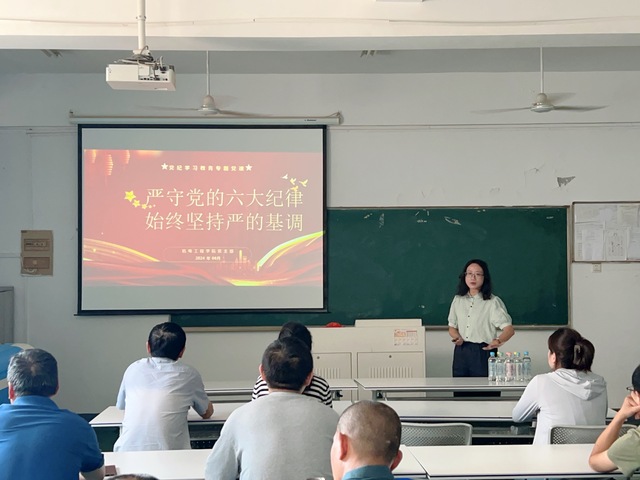 为深入学习领会新修订的《中国共产党纪律处分条例》,引导全体党员明纪法、守底线,切实把党规党纪内化于心、外化于行,2024年6月13日,机电工程学院党支部书记刘文欢为全体党员同志讲授党纪学习教育专题党课——《严守党的六大纪律 始终坚持严的基调》。