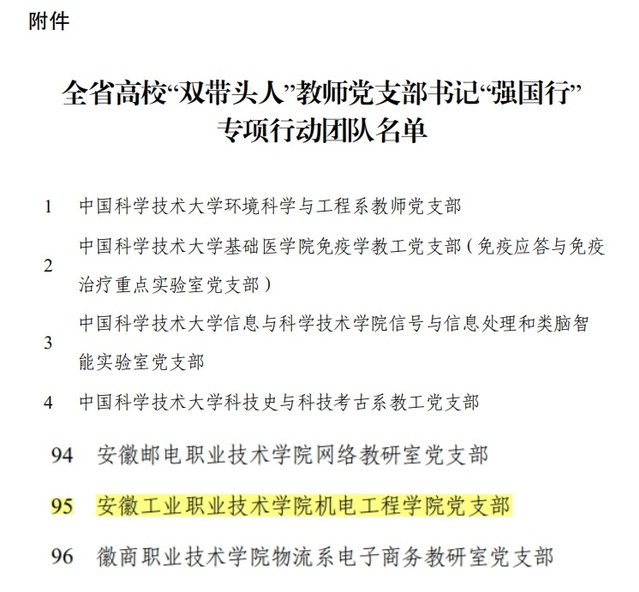 近日,安徽省委教育工委发布了《关于全省高校“双带头人”教师党支部书记“强国行”专项行动团队名单的通知》(皖教工委函〔2024〕348号),机电工程学院党支部凭借其扎实的党建工作和显著的业务成效,成功入选该名单。