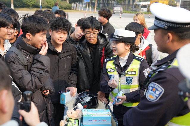活动中,宣传民警阮修婷针对安工学院学生们出行特点,提醒学生们骑行电动自行车上路必须佩戴符合标准的安全头盔,结合相关法律法规对非机动车常见的闯红灯、走机动车道、超速行驶、逆向行驶、违法载人等违法行为及其危害进行普及讲解。同时,叮嘱大学生们要时刻牢记,“一盔一带”是保障出行安全的一道重要屏障,骑乘电动车、摩托车,一定要要戴上头盔,引导大学生们做文明、守法的交通参与者。