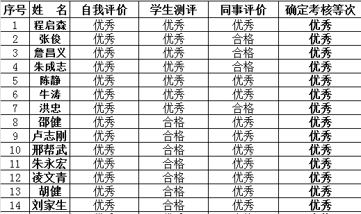 根据学院《关于开展2024-2025学年教师师德考核工作的通知》,按照《beat365官方网站师德考核实施办法》(试行),机电工程学院师德考核工作组依据41位教师平时的师德表现组织考核,并结合学生评议、同事互评等进行综合分析,评议结果经支委会研究通过,考核结果为优秀等次14人,合格等次27人,具体名单如下:
