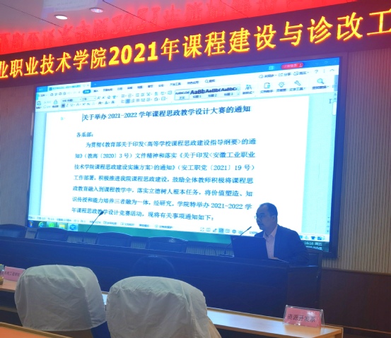 最后,教务处处长刘春友发布了学院《2021-2022年学院课程思政教学设计大赛通知》,并从竞赛主题、竞赛内容、参赛对象、评分标准及比赛规程等方面向参会老师进行了解读。刘春友表示此项大赛亦是课程层面诊改工作的其中一项,希望各教学单位以学院诊改工作为契机,认真组织学习并落实课程建设与诊改工作,最终实现教学质量提升的目的。
