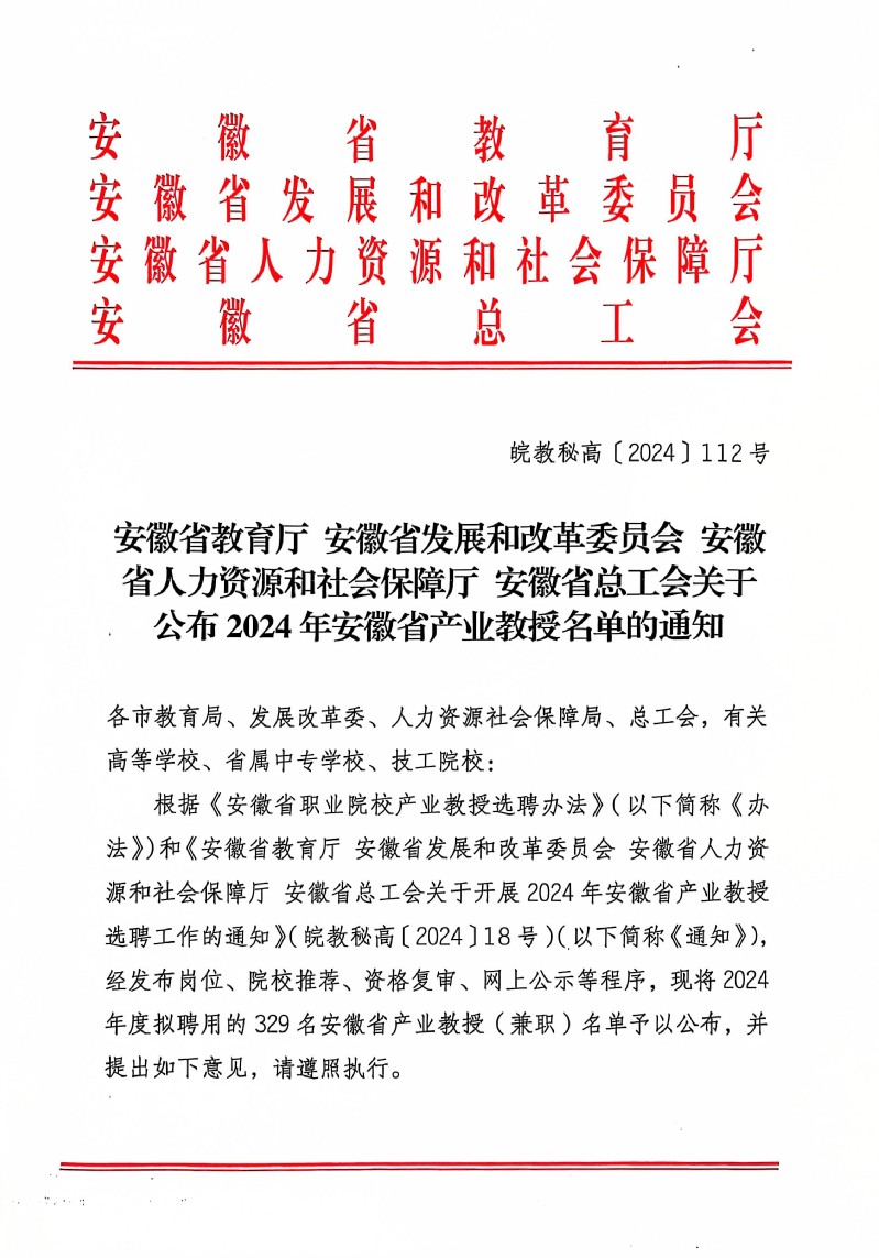 近日,安徽省教育厅、安徽省人力资源和社会保障厅联合下发《关于公布2024年安徽省产业教授名单的通知》(皖教秘高〔2024112号),经岗位发布、院校推荐、资格复审、网上公示等程序,2024年度拟聘用安徽省产业教授(兼职)329名。beat365推荐的钱庆长、王之平、黄文明、陈陶胜、方超等5人成功获批为安徽省产业教授。