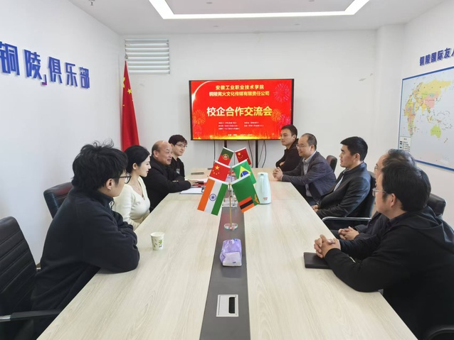 范清义一行参观了铜陵离火文化传媒公司文化走廊、业务中心、活动俱乐部等,全面了解企业的发展前景和人才需求情况。座谈会上,双方就人才培养、实习就业校企合作等方面展开交流。