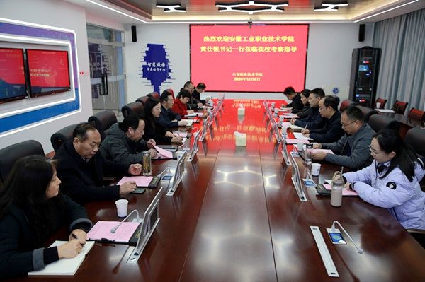 在办公楼一楼智慧驾驶舱,黄仕银一行受到六安职业技术学院党委副书记李萍,党委委员、组织人事处处长陶应峰和办公室、学生处、教务处、设备处、总务处、图书馆负责同志的热情接待。