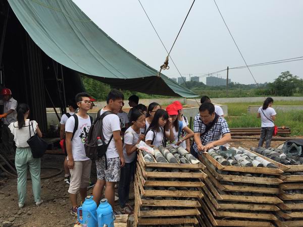 在铜陵有色矿产资源中心,该中心总工程师、工会主席汪宏,地调院院长肖福权,党群工作部副部长刘刚以及部分青年员工代表参加了此次座谈。会上,地矿中心的各位领导耐心为大学生们介绍了中心的历史、现状和铜陵地区矿物分布情况,对学生提出的如“矿产资源枯竭”等相关问题一一进行解答。中心几位优秀青年代表也结合自身工作经历从职业规划等方面与实践队成员进行了热烈交流。座谈会结束后,实践队向中心青年代表赠送了《企业法》、《劳动法》等相关法律宣传手册并来到了西湖地区铜金矿普查项目钻孔ZK901现场进行了学习。在机台外围