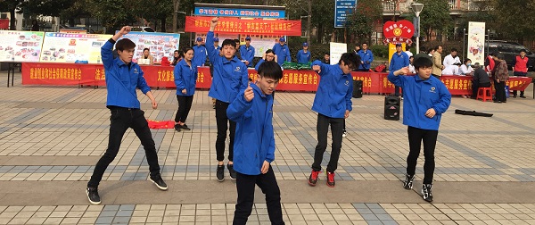 快闪是“快闪行动”的简称,是新近流行的一种嬉皮行为,可视为一种短暂的行为艺术,是当下年轻人表达青春激情的一种新方式。由学院大学生志愿者组织的“快闪族”们穿上统一的服装,在激扬的音乐声中,用动感的青春舞步,传达着绿色低碳、节能环保的理念。音乐尾声,志愿者们高高举起“铜在蓝天下·社区绿色行”的条幅。这幕不到2分钟的“环保快闪”,将时尚流行元素与绿色生态理念结合在一起,吸引了众多居民驻足,用手机、相机记录下这青春涌动的画面,感受环保精神的魅力。