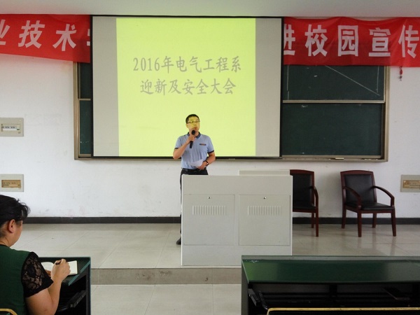 刘晓花主任主持了整个讲座,为入学新生致欢迎词,代表系部对16级新生的到来表示欢迎和祝贺。邵健书记为学生讲述了校园安全问题和文明校园生活的各注意事项,为学生树立起校园安全意识打下扎实的基础。周庆华主任就电气系的教学模式、人才培养体系、考试类型和学籍管理问题等,为16级新生做了详尽的解释,让学生对新学期的学习充满期待。