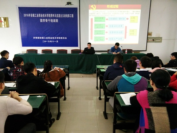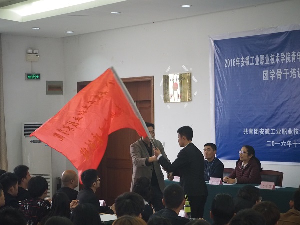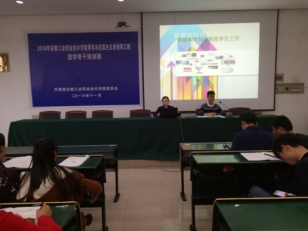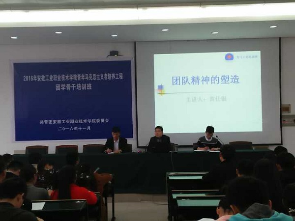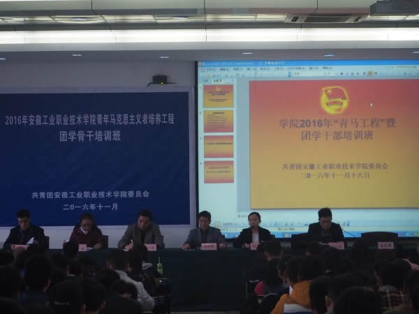 在长征胜利80周年、十八届六中全会胜利召开之际,为体悟领会习总书记提出的“六有大学生”的深刻内涵,提高学生干部的政治理论水平和工作能力,引领广大青年坚定不移地听党话、跟党走,由学院团委主办的2016年“青马工程”团学骨干培训班于11月18日至20日在201报告厅隆重开讲。开班仪式邀请到铜陵团市委副书记方小雄、团市委宣传部部长李瑶出席并讲话;学院副院长周理瑞、学院政治人事部、学生处、部分系团总支书记及172名参培学员参加了开班仪式。