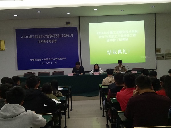 此次培训以专题讲授为主,自学谈论和实践锻炼相结合,共开设了9个专题讲座,分别涉及到“十八届六中全会学习、团队精神培养、学生干部公应用写作、新媒体下的学生工作”等方面内容。11月20日下午, 2016年“青马工程”团学骨干培训班结业典礼在团歌声中圆满落下帷幕。参训的学生干部代表纷纷表示,身处这个拥抱梦想的伟大时代,青年学生只有始终坚定理想信念和报国追求,才能创造无悔于青春、无悔于时代的骄人成绩。此次培训使自己更加坚定地用马克思注意中国化最新成果武装头脑,在今后的学习和工作中做一名让党放心、让广大学生们都满意的学生团干,为学院的发展贡献青春智慧和力量。(稿件来源:院团委)