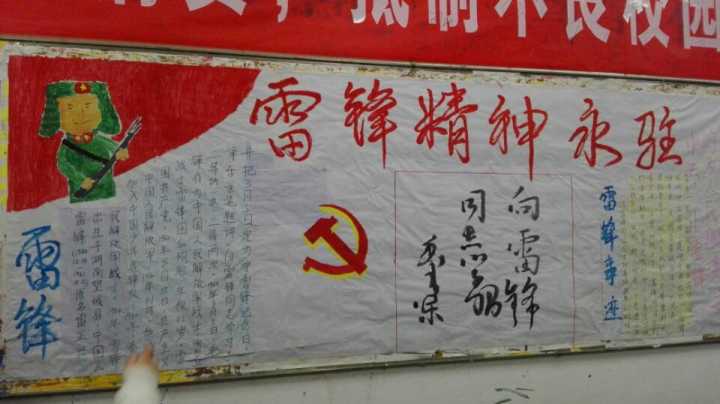 这次板报评比中同学们把对雷锋的崇敬和怀念之情深深融入到黑板报创作之中,为同学们营造了浓厚的学雷锋氛围,进而掀起同学们学习雷锋刻苦钻研的“钉子”精神、生活中的“向上”精神、人际关系的“向善”精神。