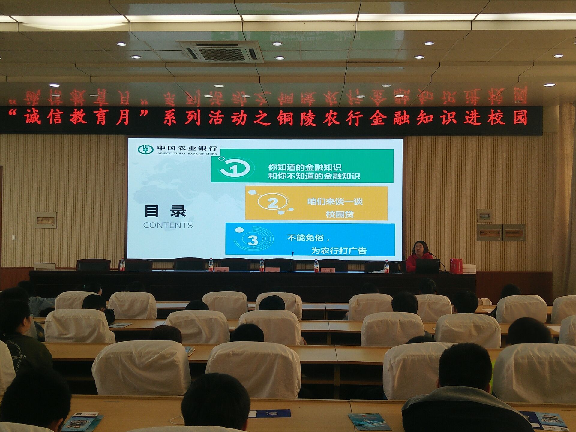 为进一步教育引导在校学生增强金融风险防范意识和金融安全意识,提升自我保护能力,促进学生进一步养成良好消费习惯,远离不良网贷、提高防范不法侵害的能力,4月21日下午,学院联合铜陵市农行走进校园举办“金融知识进校园”主题宣传教育讲座。