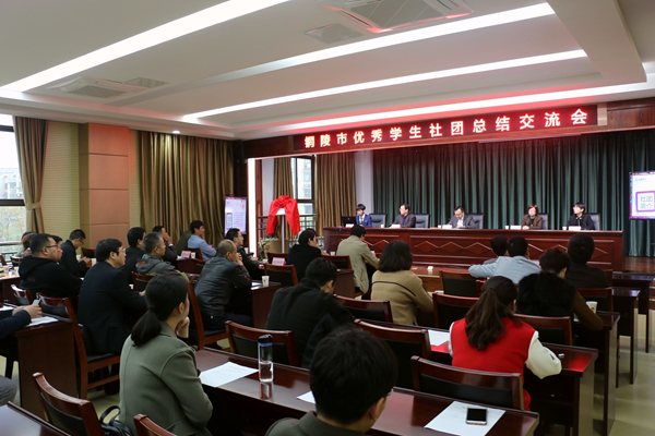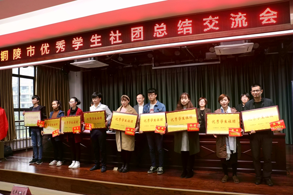11月16日下午,由团市委、市教育局、市学生联合会共同主办的铜陵市首届“优秀学生社团”经验总结交流会暨表彰大会在天井湖社区举行。与会领导为获得首届“优秀学生社团”称号的社团进行了颁奖,社团负责人、指导教师和学校代表进行了总结交流。