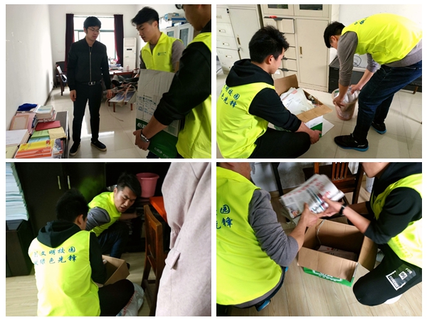 3月30 日上午,“绿色先锋”环保小分队走进学院各办公楼开展了第一次回收活动。活动受到了学院领导和老师们的一致好评。不少老师表示:“办公室日积月累的杂物很多,以前都要打电话喊回收物品的人上门来收,现在方便多了,对学生来说也是很好的锻炼。”据悉,该院“校园文明劝导”活动自2014年开展以来,从最初的“校园文明劝导岗”、“就餐文明劝导岗”、“学生党员示范文明岗”、“周末夜间安全劝导岗”到今年新增的“绿色先锋环保岗”,既展示了学院精神文明创建的进步,也旨在通过多元的途径进一步推动大学生文明养成教育,促进每位学生成为文明的宣导者和践行者。