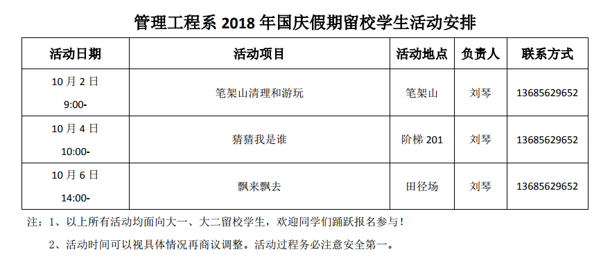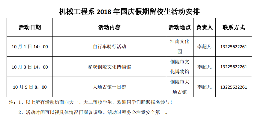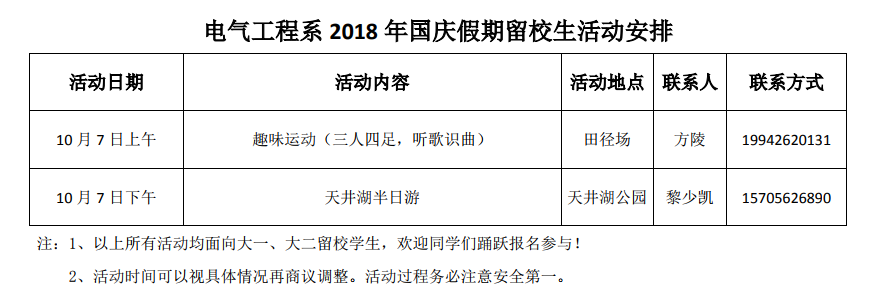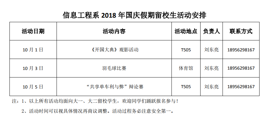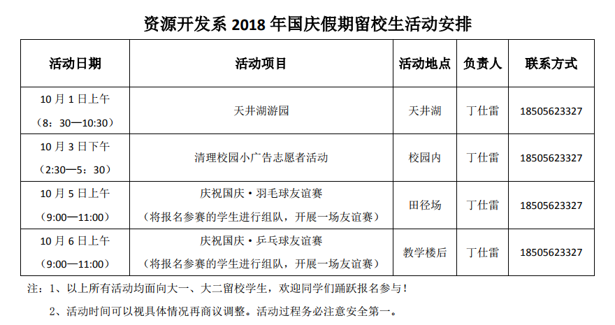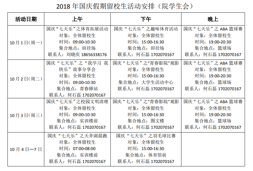 2018年国庆假期留校学生活动安排