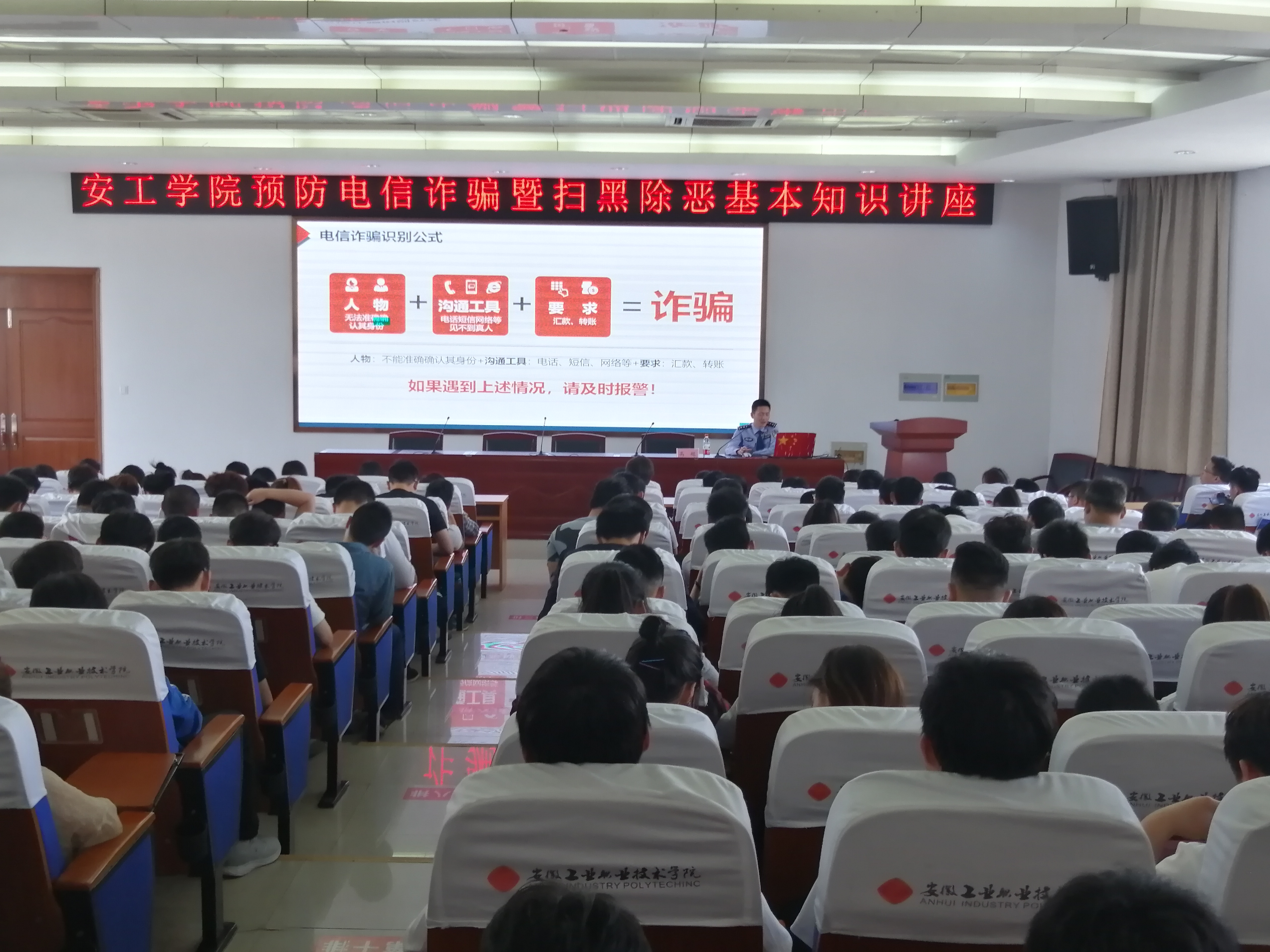 为进一步提高学生识骗、防骗的能力,预防和减少电信及网络诈骗案件的发生,了解涉及黑恶势力的校园犯罪行为,远离黑恶势力,并能在危急时刻保护好自己的人身安全。学院团委于4月19日在阶梯201报告厅组织开展了预防电信诈骗暨扫黑除恶基本知识安全讲座。本次讲座邀请铜陵市公安局经开分局治安大队高超警官现场和大家进行了交流,各系部共近250名学生参加。