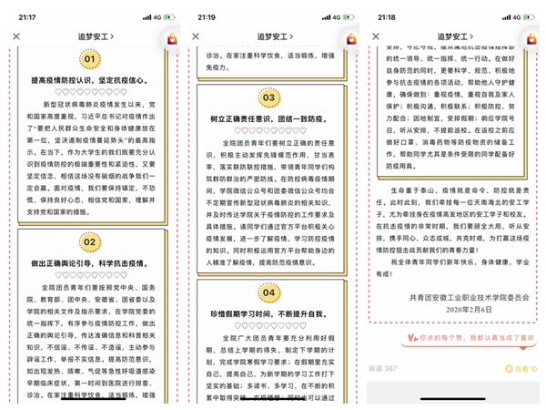 宣传发声有高度。面对网络信息纷繁复杂的现象,院团委充分发挥团学组织新媒体平台建设优势,将传递学院党政的正能量、树立抗“疫”的青年典型、关注学子对疫情的舆论等作为重点工作,将团员青年的思想引领做在网上,做在第一时间,做进青年学生心里,凝聚共识,坚定信心。一是通过学院团委官方微信公众号第一时间向学生传达学院关于疫情防控的相关精神;二是开展青年大学习—疫情防控知识专题宣传,每日推送新华社、人民日报等权威官方媒体及各级党委、政府关于疫情防控的信息和科普知识,做好疫情防控知识宣传教育,引导青年学生了解疫情传播途径、防治办法,切实增强自我防护意识和自我保护能力,做到科学防控,不信谣、不传谣;三是开展疫情防控网上宣誓活动,号召青年学生积极配合所在地党委、政府和防控中心的防疫工作,并发出网上誓言,院团委择优在微信公众平台刊发,营造众志成城抗击疫情的舆论氛围。