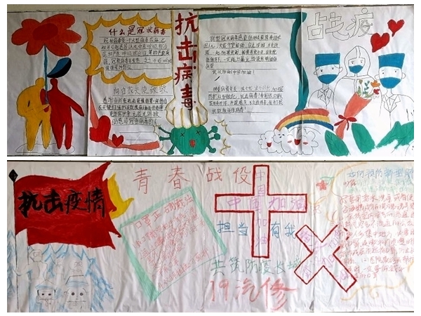 班级板报是校园防疫工作的重要宣传窗口之一。活动中,各个班级积极筹划,认真查阅、收集有关新冠肺炎的资料,精心选材并设计版面,绘制出一幅幅主题鲜明、图文并茂的疫情防控主题板报,科普了一条条抗疫知识,展示了一幕幕抗疫场景。