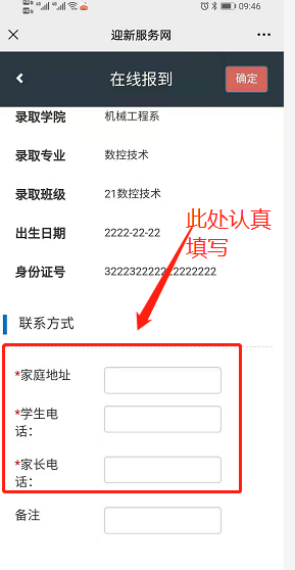4、进入“在线报到”环节后,请认真核对个人信息,并正确填写家庭详细地址、个人联系电话、家长联系电话。如下图: