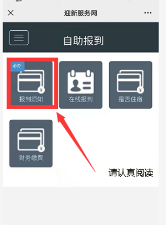 首先点击“报到须知”,请务必认真阅读,阅读完后点击“确定”按钮,点击“下一步”进入“在线报到”环节。
