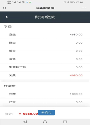6、进入“财务缴费”环节后,请核对缴费信息,点击“去支付”按钮。如下图: