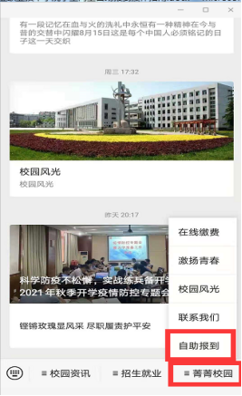 2、进入微信公众号后,点击“菁菁校园”菜单,点击菜单中的“自助报到”按钮打开新生在线自助报到系统。如下图: