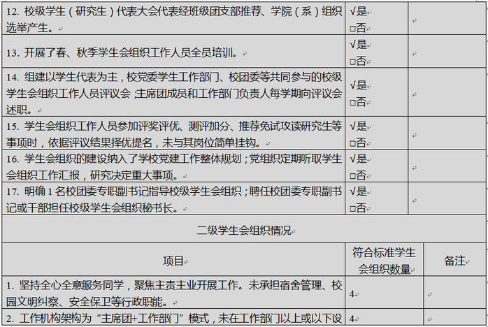 第十八条 建立健全院学生会每年至少1次通过集中会议或书面形式听取全部系学生会工作报告及意见建议的制度;建立完善院学生会对系学生会工作的考核机制,考核结果进行公开。